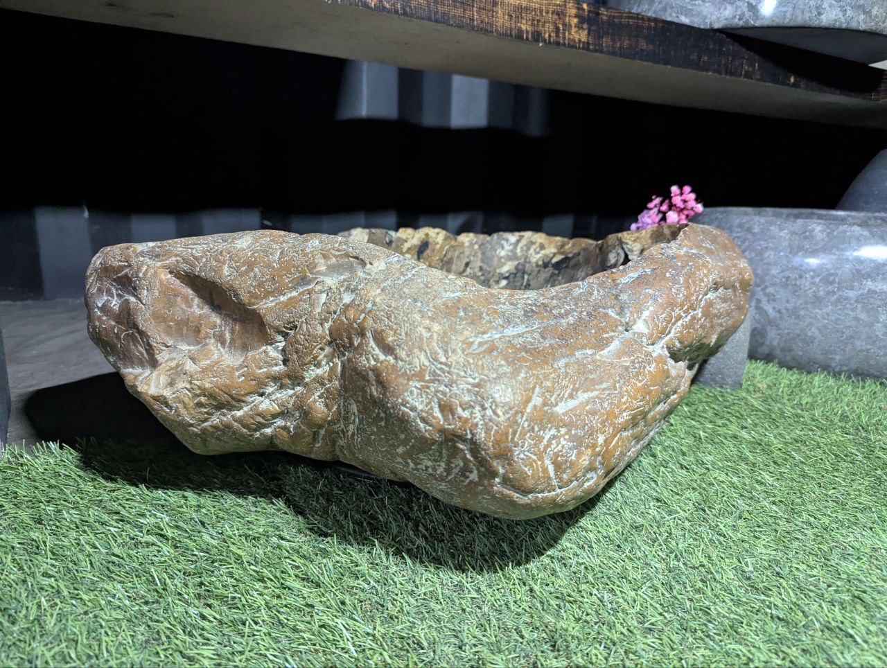 Раковина из окаменелого дерева (fossil / petrified wood) 915-654818 размером 65 × 48 × 18 см — крупная модель с природной формой. Снаружи сохранена натуральная необработанная поверхность, внутри — гладкая отполированная чаша с выразительным древесным рисунком и кольцами.Размер: 65 × 48 × 18 смОтверстие: 40 ммМатериал: окаменелое дерево (fossil wood / топляк)Вес: ~40–60 кгОсобенность материала (топляк):