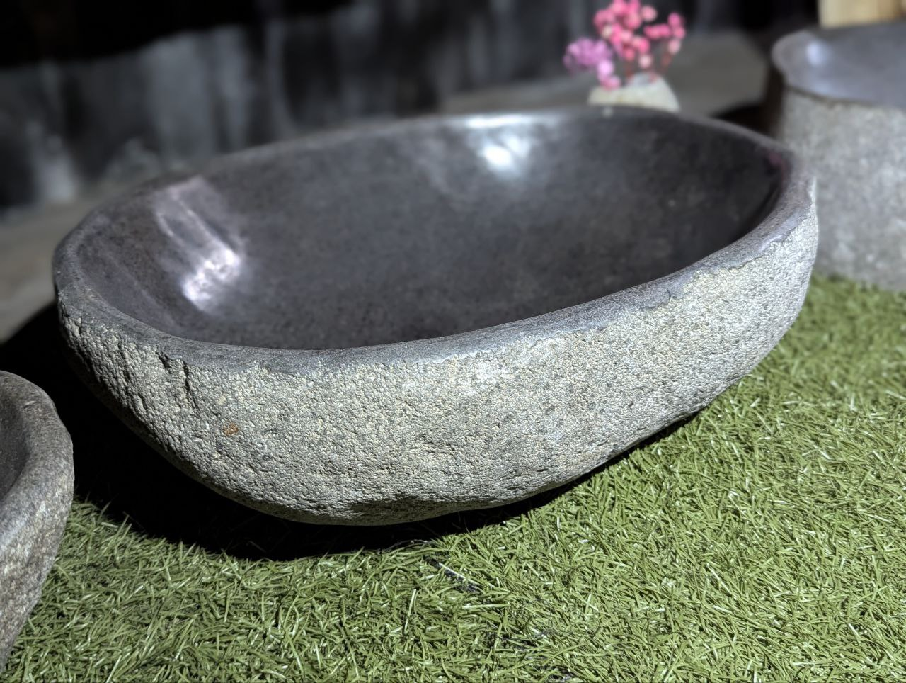 Раковина вырезана вручную из цельного речного валуна. Сохранив природную форму и текстуру снаружи, мастера шлифуют внутреннюю часть до гладкости для комфортного использования. Каждое изделие уникально по цвету, форме и структуре — точной копии не существует.