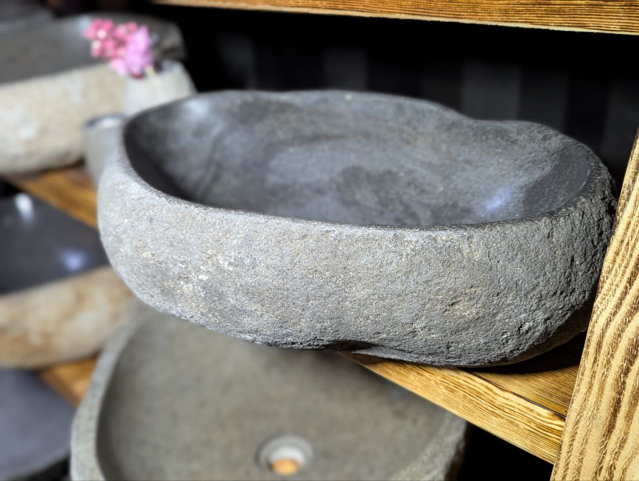 Раковина вырезана вручную из цельного речного валуна. Сохранив природную форму и текстуру снаружи, мастера шлифуют внутреннюю часть до гладкости для комфортного использования. Каждое изделие уникально по цвету, форме и структуре — точной копии не существует.