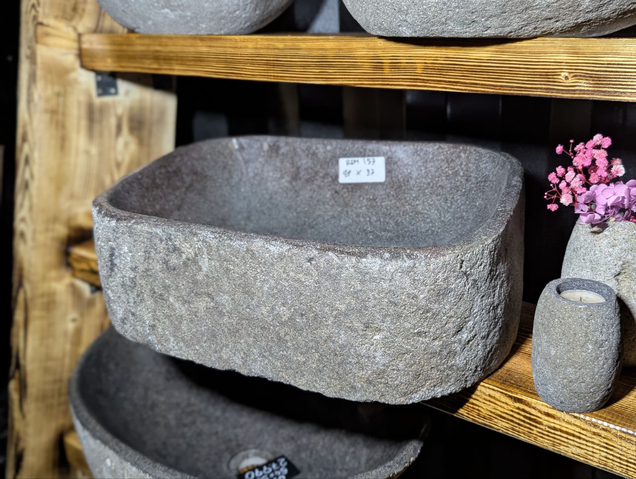 Раковина вырезана вручную из цельного речного валуна. Сохранив природную форму и текстуру снаружи, мастера шлифуют внутреннюю часть до гладкости для комфортного использования. Каждое изделие уникально по цвету, форме и структуре — точной копии не существует.