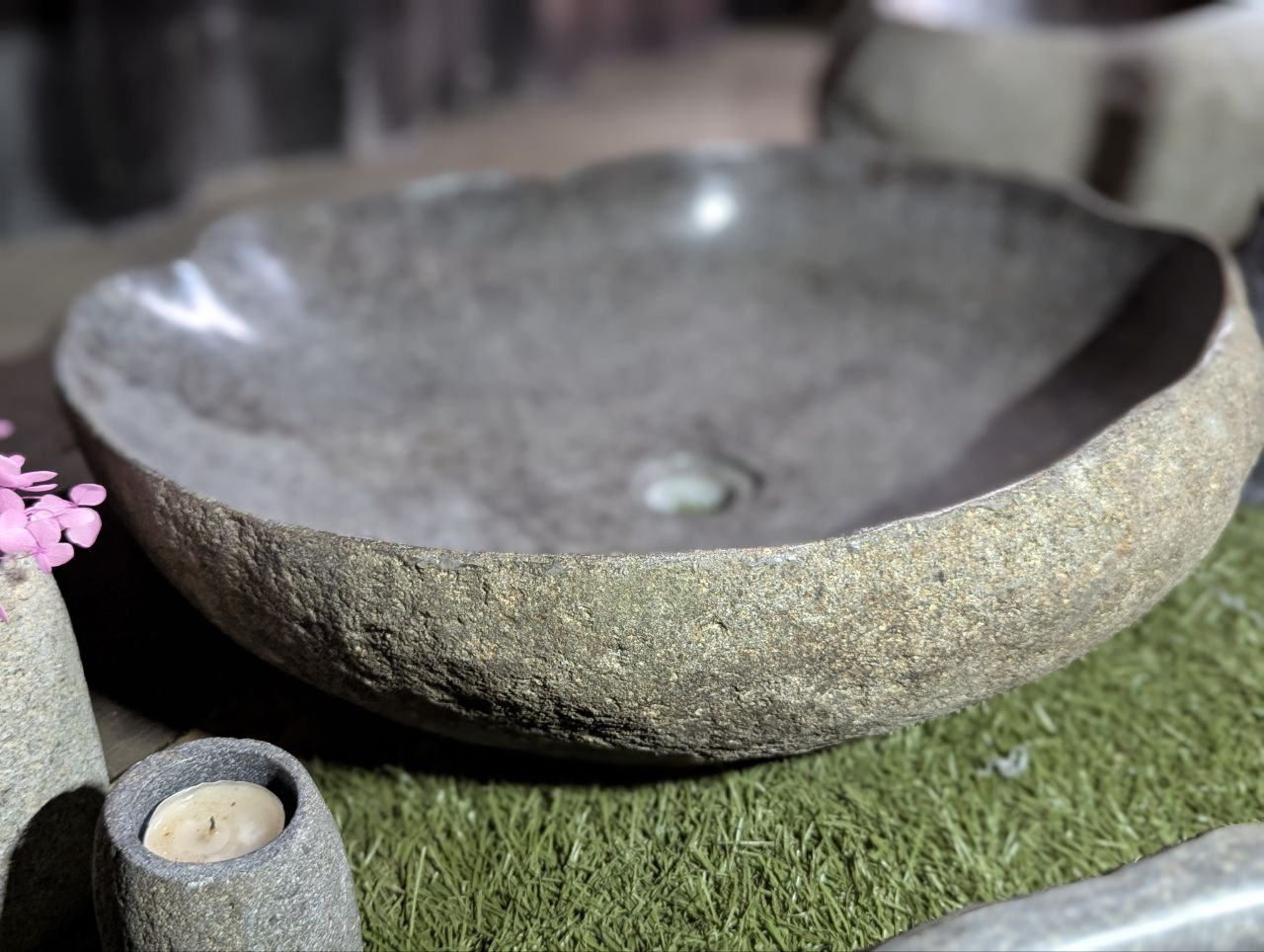 Раковина вырезана вручную из цельного речного валуна. Сохранив природную форму и текстуру снаружи, мастера шлифуют внутреннюю часть до гладкости для комфортного использования. Каждое изделие уникально по цвету, форме и структуре — точной копии не существует.