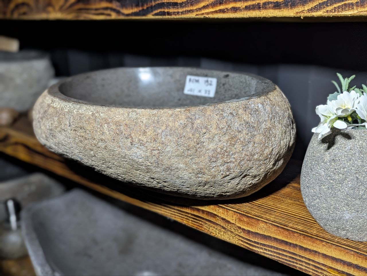 Раковина вырезана вручную из цельного речного валуна. Сохранив природную форму и текстуру снаружи, мастера шлифуют внутреннюю часть до гладкости для комфортного использования. Каждое изделие уникально по цвету, форме и структуре — точной копии не существует.
