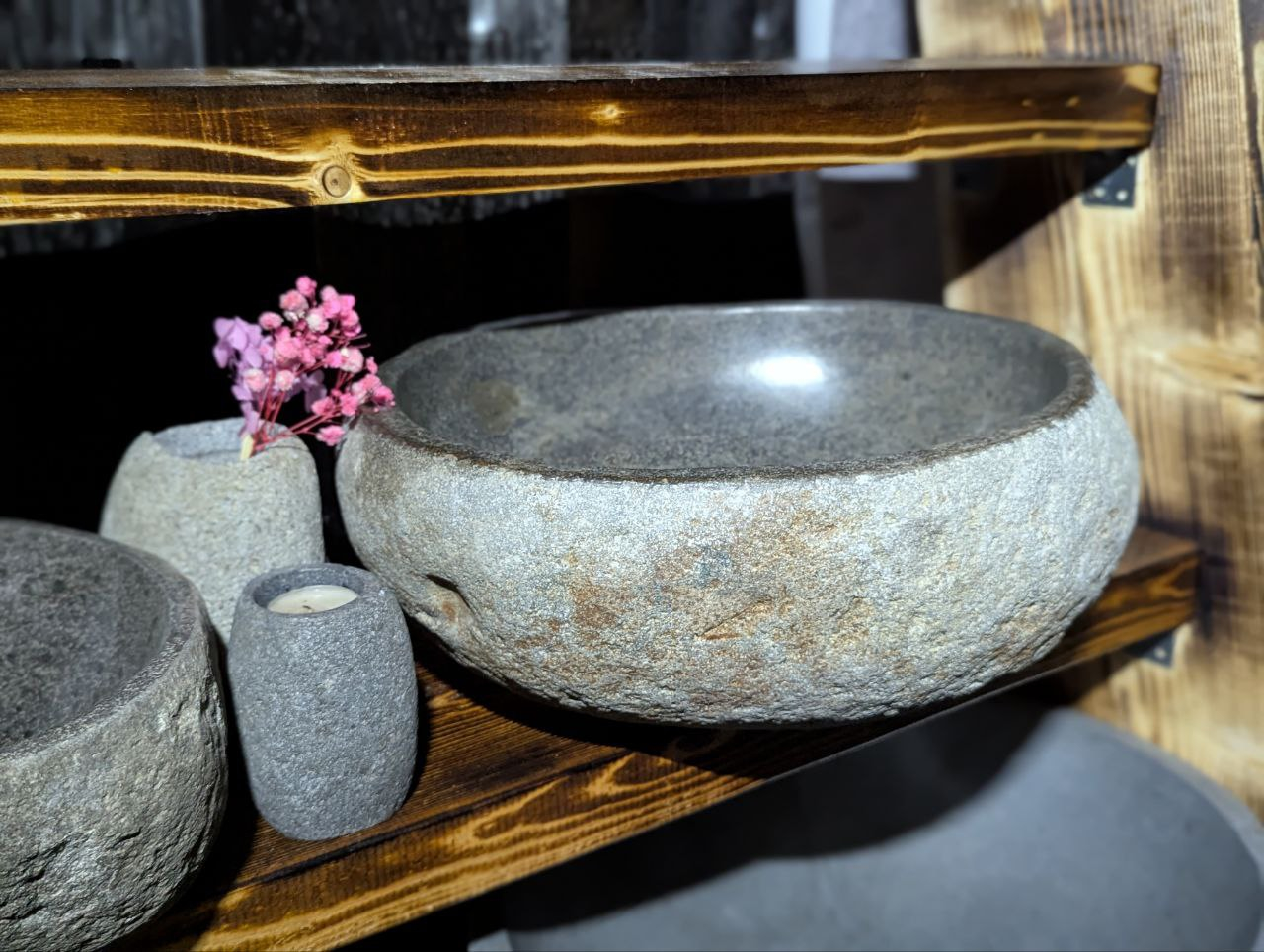 Раковина вырезана вручную из цельного речного валуна. Сохранив природную форму и текстуру снаружи, мастера шлифуют внутреннюю часть до гладкости для комфортного использования. Каждое изделие уникально по цвету, форме и структуре — точной копии не существует.