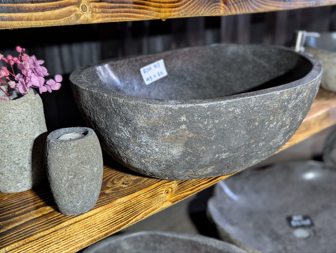 Раковина вырезана вручную из цельного речного валуна. Сохранив природную форму и текстуру снаружи, мастера шлифуют внутреннюю часть до гладкости для комфортного использования. Каждое изделие уникально по цвету, форме и структуре — точной копии не существует.