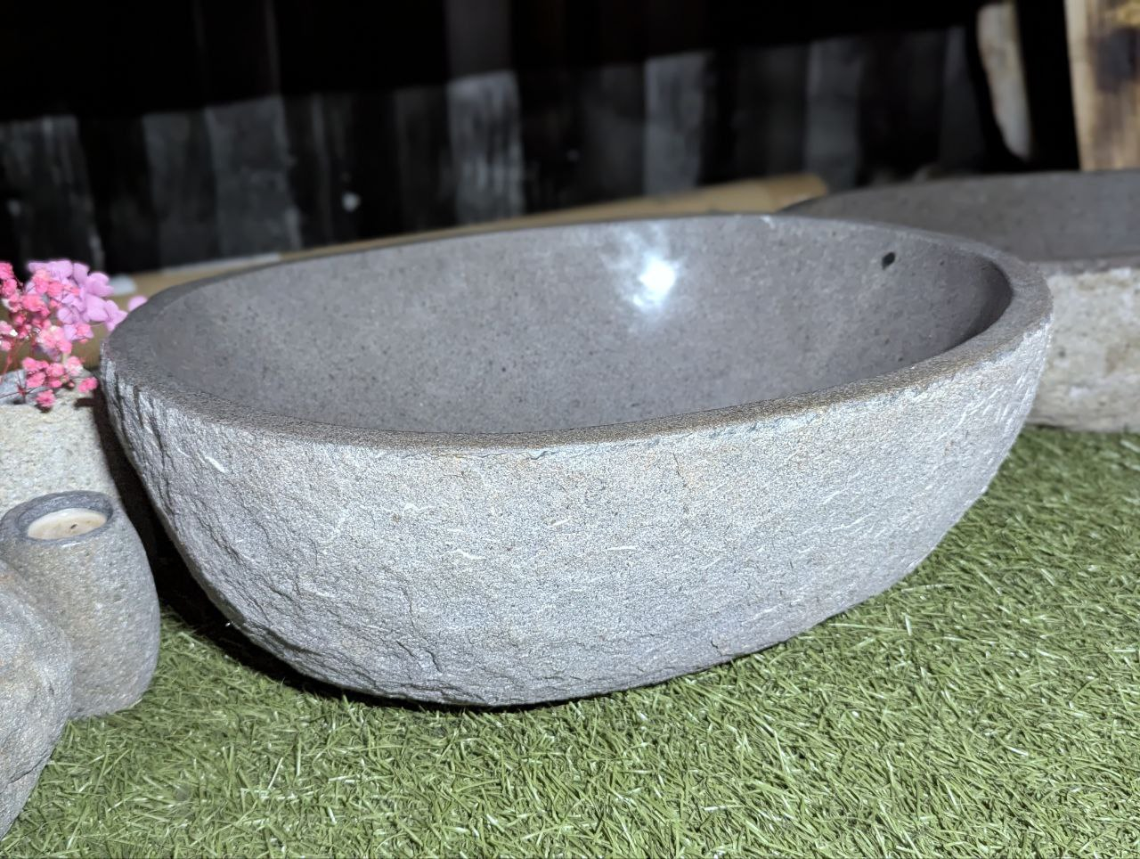 Раковина вырезана вручную из цельного речного валуна. Сохранив природную форму и текстуру снаружи, мастера шлифуют внутреннюю часть до гладкости для комфортного использования. Каждое изделие уникально по цвету, форме и структуре — точной копии не существует.