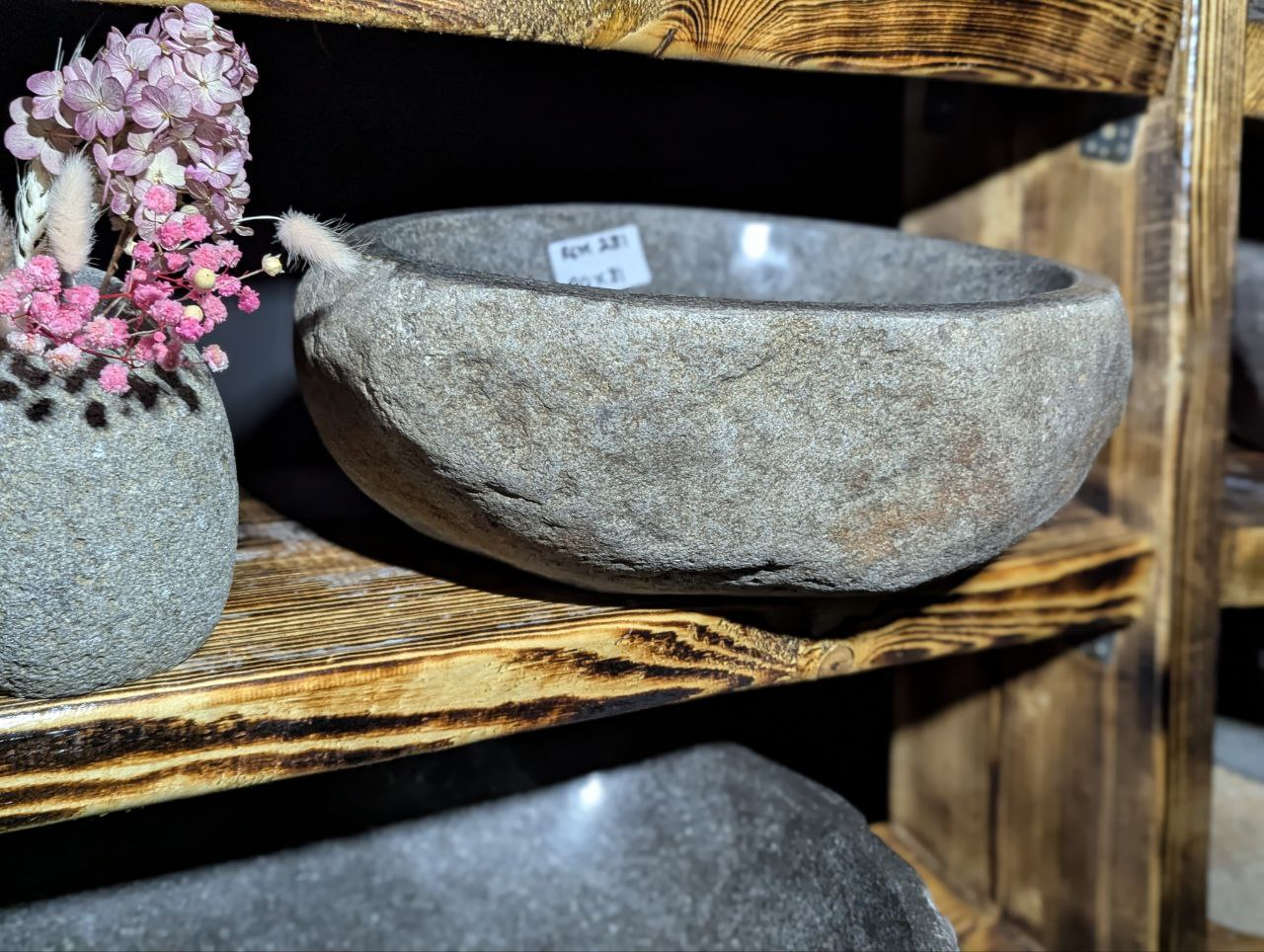 Раковина вырезана вручную из цельного речного валуна. Сохранив природную форму и текстуру снаружи, мастера шлифуют внутреннюю часть до гладкости для комфортного использования. Каждое изделие уникально по цвету, форме и структуре — точной копии не существует.