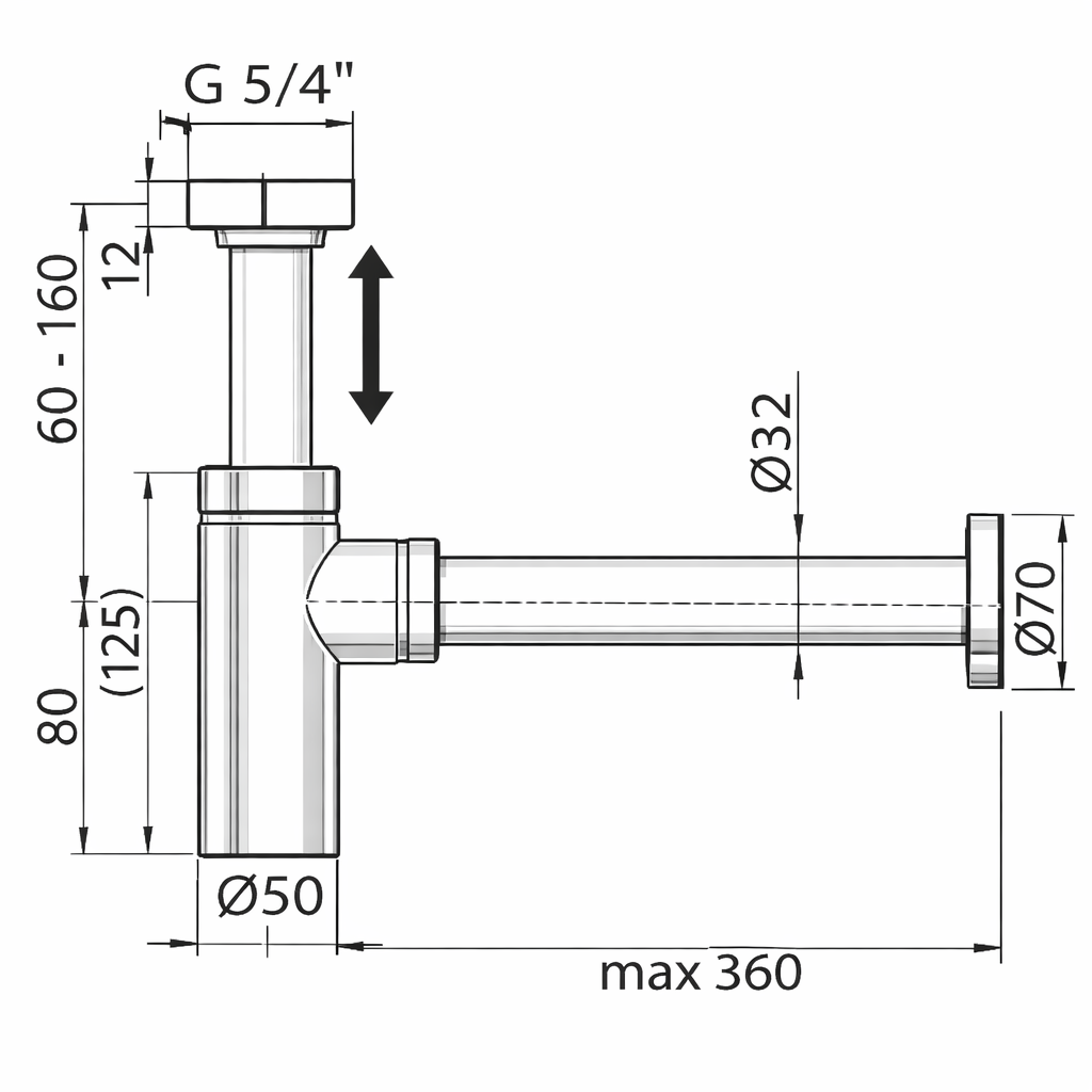 - Высота: 60–160 мм (регулируемая) Гидрозатвор: 80 мм Диаметр трубы: Ø32 мм Выход в канализацию: Ø50 мм Декоративная чашка: Ø70 мм Длина: до 360 мм